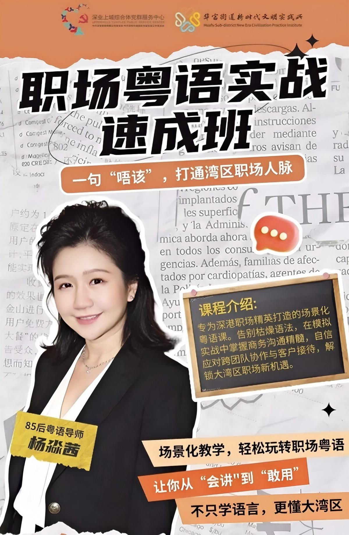 履历:85后粤语导师,拥有内地幼教专业背景及流利粤普双语能力。曾从事户外研:学教育五年,善于在真实场景中活化语言教学。现任罗湖及福田社区粵语课程导师其教学融合成人教育方法与文化实践,生动亲切。