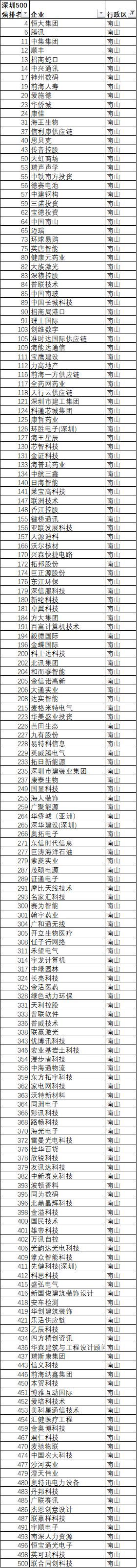 2、福田区:以112家名列次席,全市占比23.6%。每平方公里1.43家,500强密度全市第一。值得一提的是,深圳100强福田37家,排名第一,其中前十独占5席,说明福田大企业云集。因此,500强总营收,福田排名第一。福田作为全市行政和金融中心,产业基础雄厚,和南山构成深圳的中流砥柱。