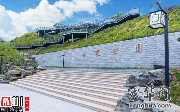 玉龙公园位于民治街道,深圳北站片区南侧,北玉龙路与金龙路之间,占地面积约5.02万平方米。公园以桂花为主题,以生态山林为基底,运用江南园林构造手法,分为闻木樨香景区、溪畔岩桂景区、小山丛桂景区、蟾宫折桂景区、幽山吟桂景区和九曲花道景区等六大特色分区。