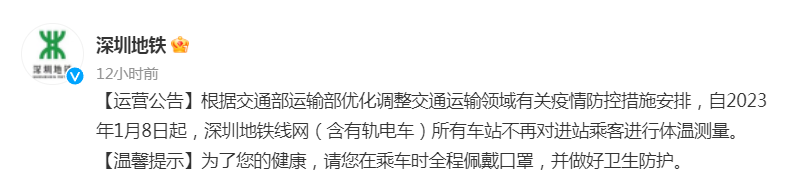1月6日,深圳地铁官方微博发布运营公告,自1月8日起,取消地铁进站乘客体温测量。